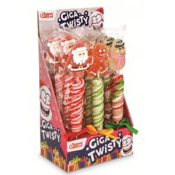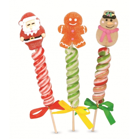 Sucette twistée en sucre cuit est surmontée d'une figurine de Noël en pâte de fruits.