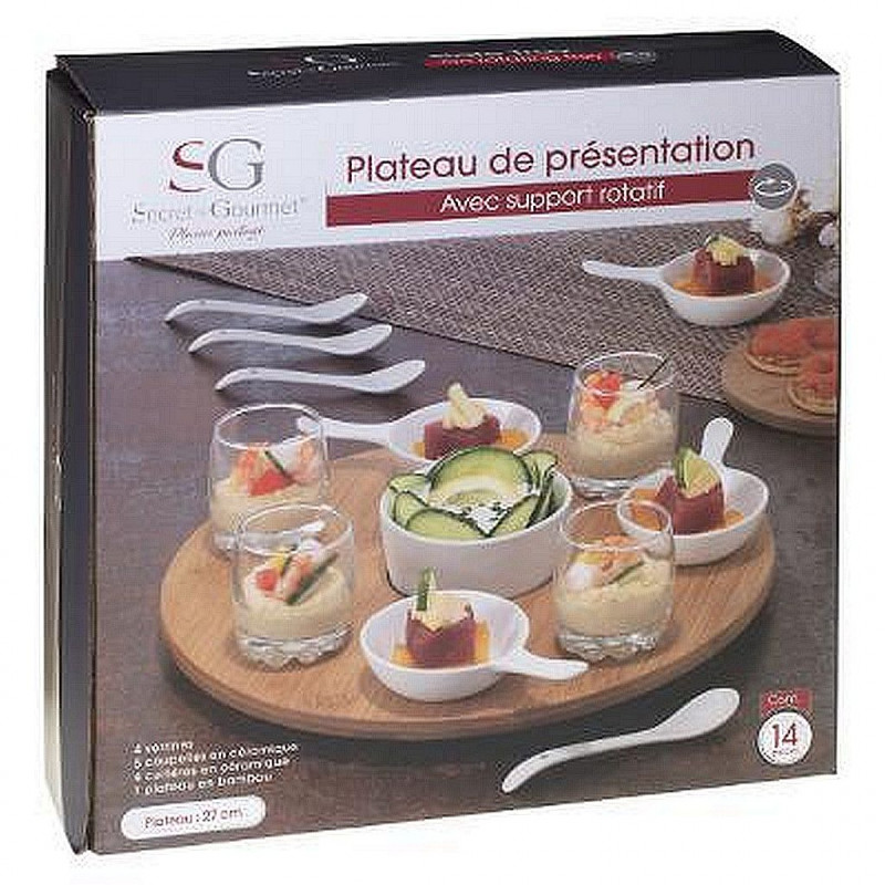 Détail dimensions: Plateau rond : d. 27cm x h. 2,5cm / verrine verre : d. 5cm x h. 6cm / Cuillère : h. 11cm /