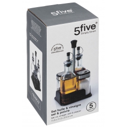 Set huile/vinaigre et sel et poivre, composé de 2 bouteilles en verre au format 160ml avec 2 pots en verre au format 100ml. Rack en plastique et inox.