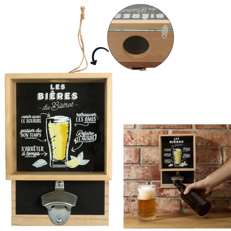 Faites de la concurrence aux pubs et accrochez fièrement les capsules de bière dans cette boîte transparente qui est en réalité un décapsuleur mural ! Décapsulez. stockez et affichez vos exploits. succès garanti ! Le verre illustré coulisse par le haut pour permettre de vider le stock de capsules